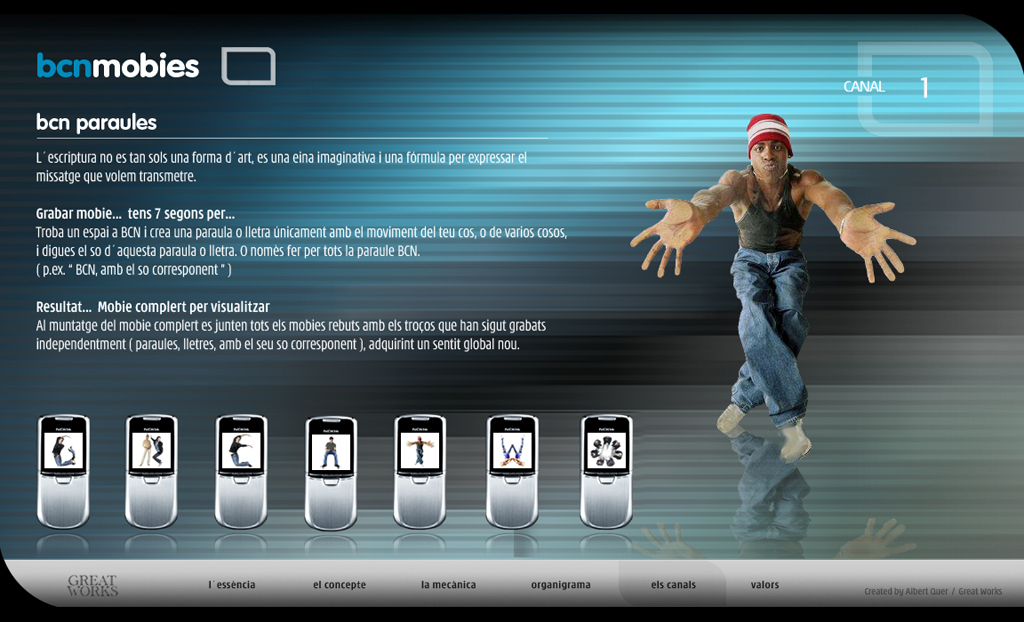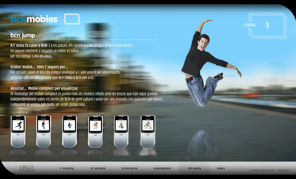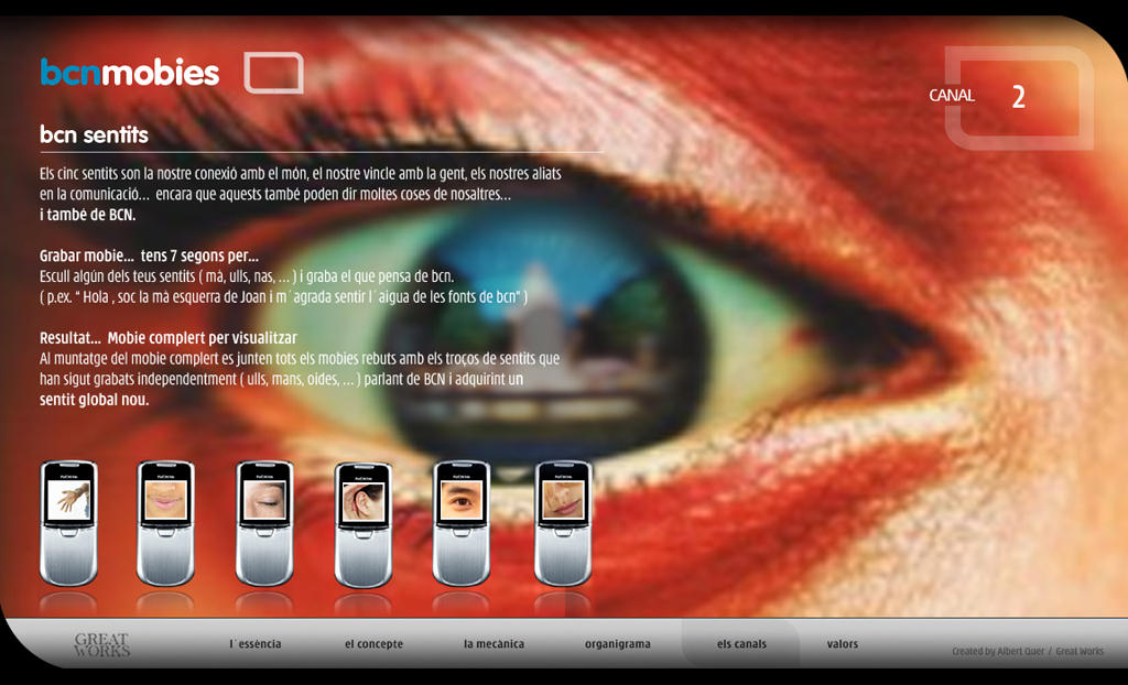 Cada usuario graba con su móvil un vídeo “Mobie” de máximo 5 segundos y lo envía. Todos los Mobies se reciben en una aplicación que los enlaza automáticamente, creando una única película que se publica en el canal que el usuario haya decidido participar: bcn palabras, bcn sentidos, bcn jump, bcn sonidos, …