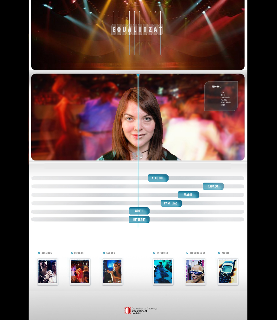 Equalitza´t es un aplicación de gamificación orientada a jóvenes de 14 a 25 años que propone una experiencia de usuario en la prevención y el conocimiento de las situaciones de riesgo asociadas al consumo de drogas, alcohol, tabaco y a las nuevas adicciones del siglo XXI. El “ecualizador” refleja en la pantalla los efectos que genera cada situación de riesgo y consumo de drogas en el rostro y rasgos faciales del usuario a la vez que muestra la informacion de lo que ocurre en cada caso.
